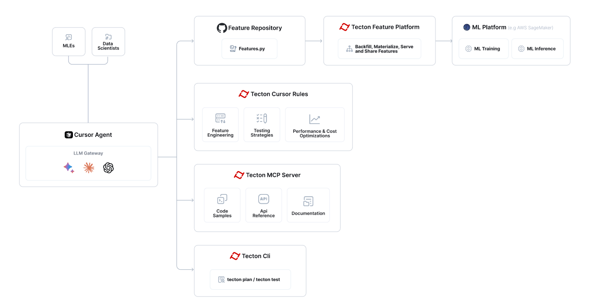 The Tecton MCP integrates with LLM-powered editors like Cursor to provide tool-based context and assistance for feature engineering: