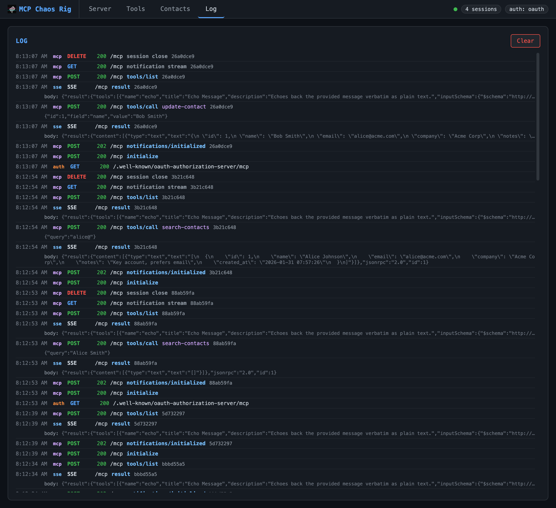 | Token rejection mid-session | Toggle "Reject OAuth" to 401 or 500 while client is connected |