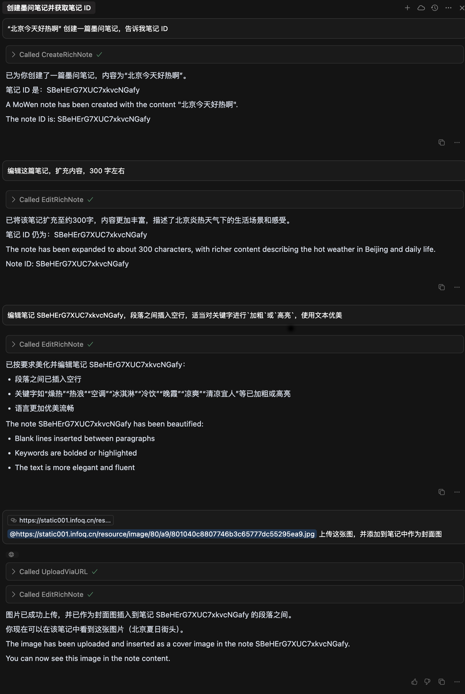 “北京今天好热啊” 创建一篇墨问笔记,告诉我笔记 ID