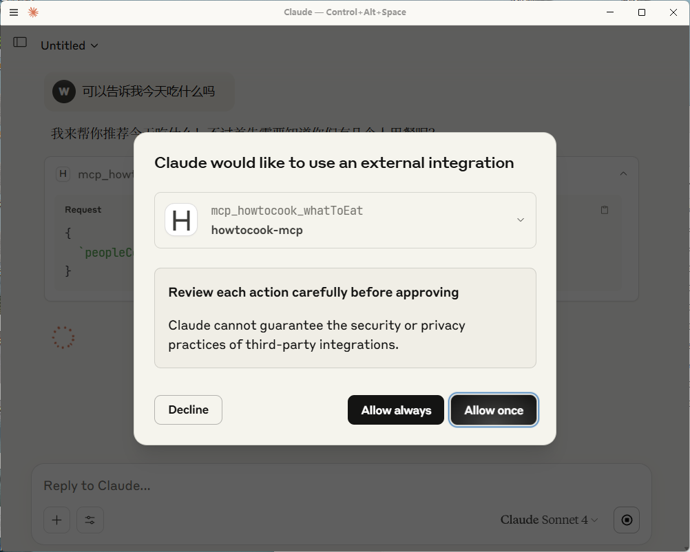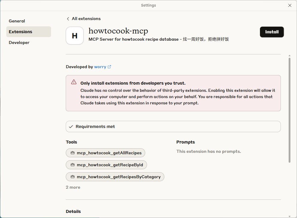现在,任何支持 DXT 的应用都可以运行您的本地 MCP 服务器。例如,使用适用于 macOS 和 Windows 的 Claude 打开该文件即可显示安装对话框