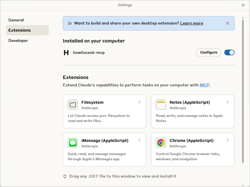 如下:请确保你已经安装了最新版的 Claude Desktop, 当前 MCP 的 DXT 文件已上传代码库,可以自行下载或者 Fork 本仓库自行构建